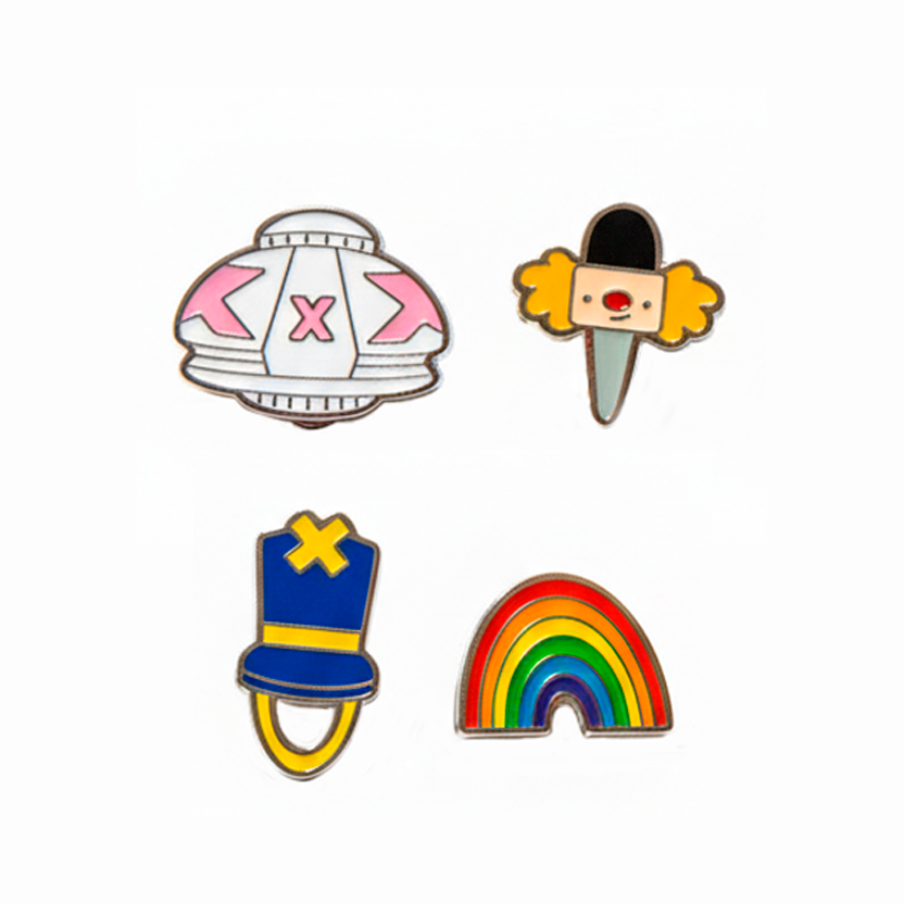 O kit contém: 1x pin Nave Branca 1x pin Microfone 1x pin Arco-íris de Energia 1x pin Paquita Azul